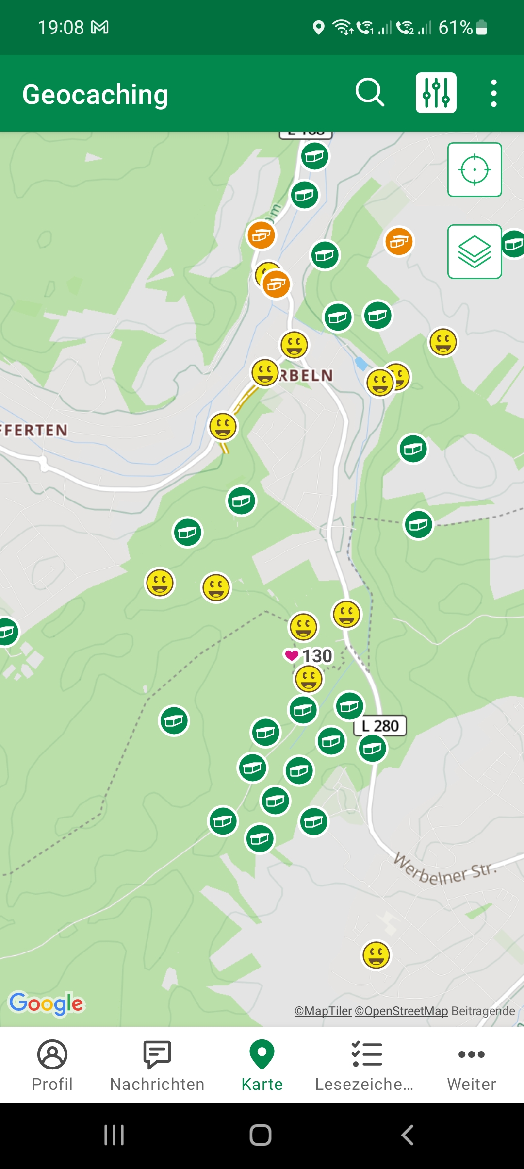 Kartenansicht in der offiziellen App von Geocaching.com